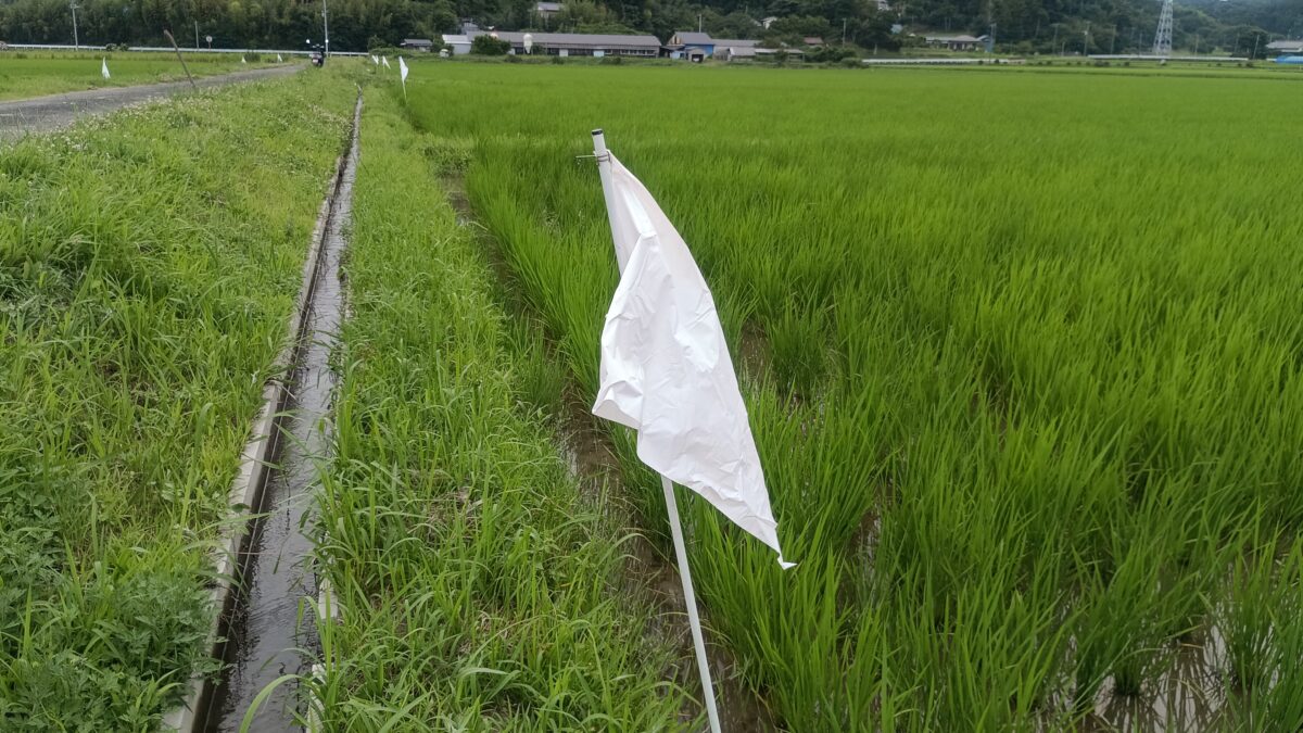 三芳地区内でも山間部や農薬不使用の圃場が多い場所は行われません。私の圃場にも影響がある場所があるので、そこには散布拒否?の白旗を立てます。